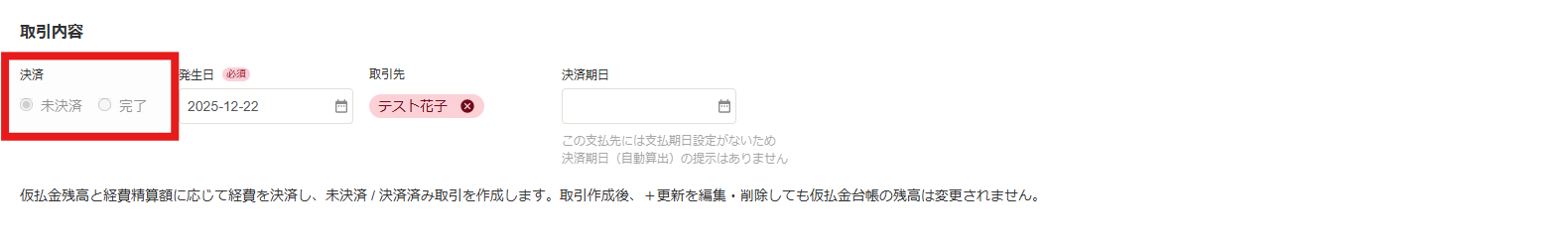 また、仮払金と関連付けた経費精算を取引登録する際は、仮払金の残高と経費精算額を計算して未決済または決済済みの取引を作成するため、経費精算画面での未決済・完了の選択はできません。