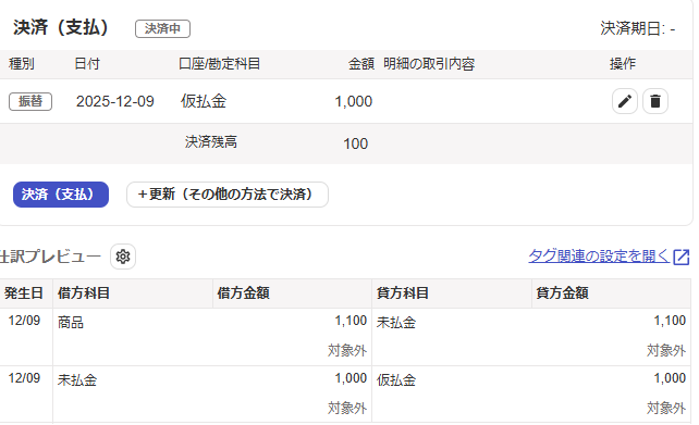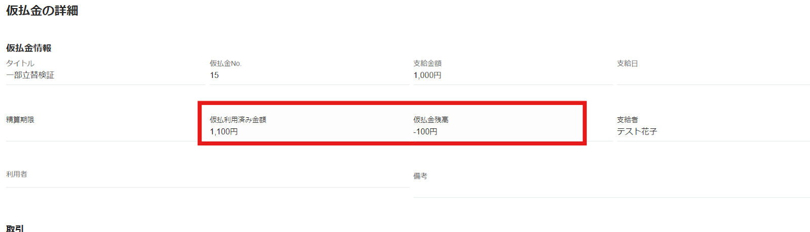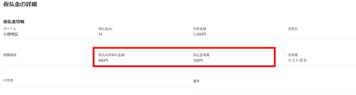仮払金画面:残高が「マイナス」で表示され、追加支払が必要なことがわかります。