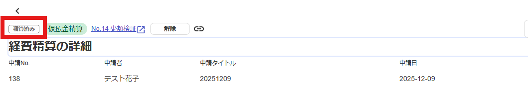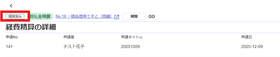 経費精算ステータス:「精算済み」として処理。