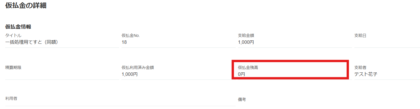 仮払金画面:残金「0円」と表示されます。