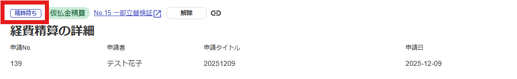 経費精算ステータス:「精算待ち」となります。