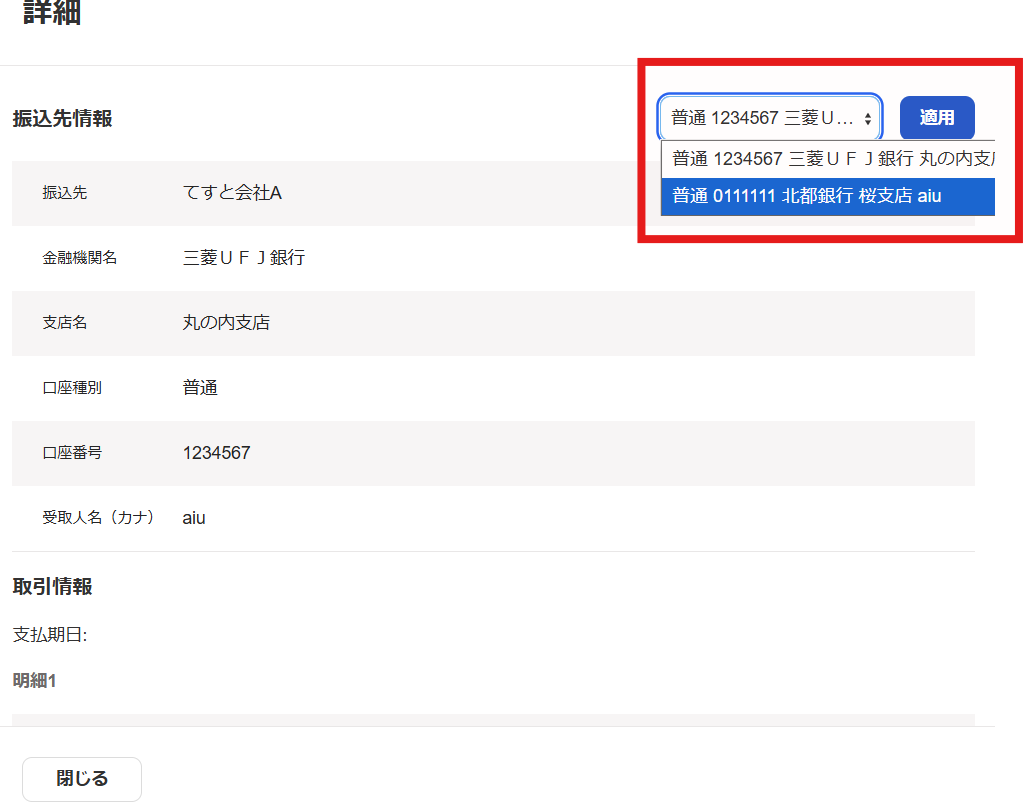 クリックすると、登録されている複数の口座情報が表示されます。ここで、振り込みたい口座を選択し、「適用」をクリックします。