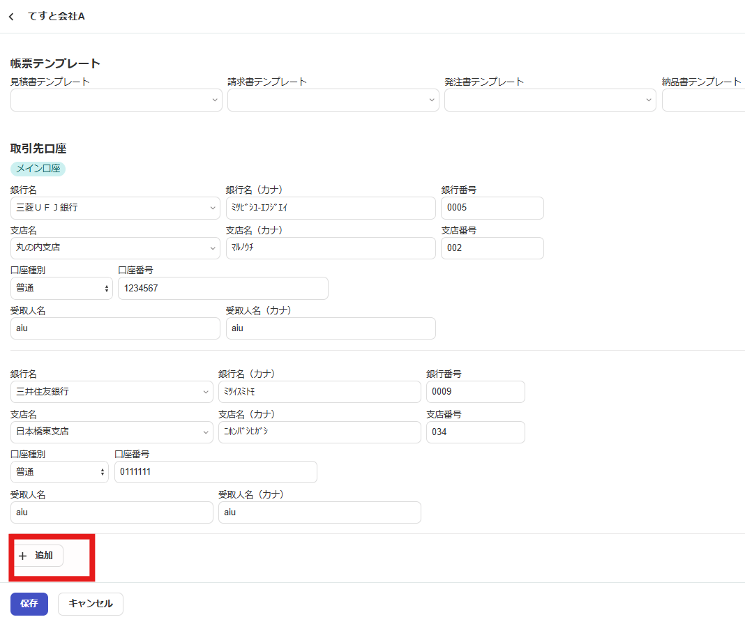 ここで、追加したい振込先口座の情報を入力し、登録します。これにより、同一の取引先に対して複数の口座情報が紐づけられます。