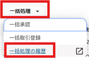 • 一括処理の行: 実行日時、処理内容(承認/取引登録)、合計件数、承認失敗件数、現在の処理ステータス(処理中・完了)などが確認できます。