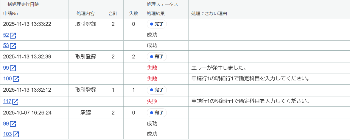 一括処理は、実行から完了までに時間がかかる場合があります。処理の結果や、失敗した申請の詳細については、「一括処理の履歴」画面で確認できます。