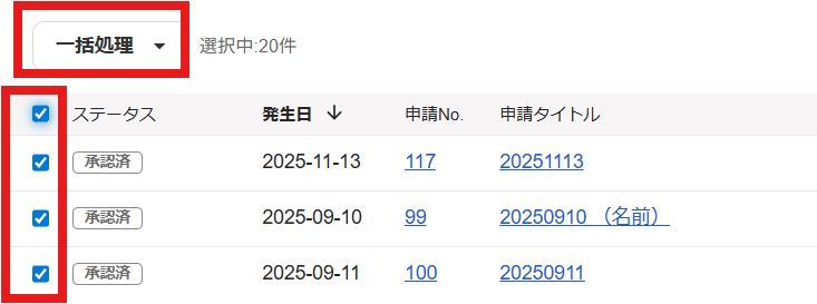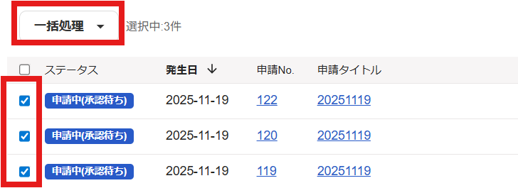 画面上で、まとめて承認したい申請にチェックを入れます。