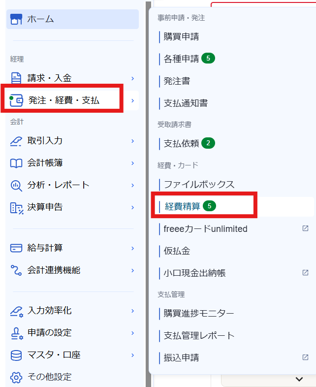 freee会計の[発注・経費・支払]メニューから[経費精算]画面へ移動します。