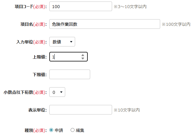 • 項目:「補助項目申請」または「補助項目編集」