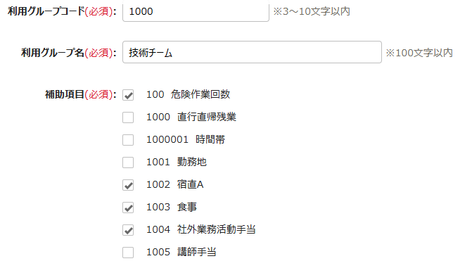 • 項目:「勤怠管理設定」内の「補助項目編集機能を使用する」にチェックを入れる